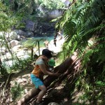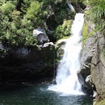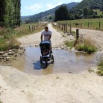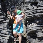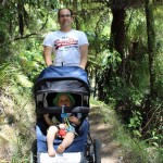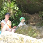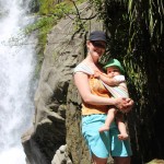 Am nächsten Morgen sind wir dann mit Baby auf dem Rücken durch ein trockenes Flussbett zum Gletscher gewandert. Das hatten Jörg und ich vor vier Jahren auch schon gemacht, aber das Erlebnis war diesmal ein ganz anderes. Könnte natürlich am Wetter gelegen haben, denn während es damals in Strömen geregnet hat und wir den Weg fast allein gelaufen sind, waren diesmal während der Hochsaison und bei strahlendem Sonnenschein zwar nicht gerade Menschenmassen, aber doch ein ganzer Haufen Leute mit uns unterwegs. Was uns aber sehr beeindruckt hat, ist, wie sehr sich der Gletscher seit unserem letzten Besuch verändert hat. Genauer gesagt, wie weit er sich seither zurückgezogen hat. Denn an der Stelle, wo diesmal der Aussichtspunkt war und wir standen, war 2011 noch Gletscher. Damals konnte man auch von dort aus noch in den Gletscher einsteigen (mit geführter Tour, allein lassen die Kiwis einen da nicht hoch), während man inzwischen nur noch mit dem Helikopter da rauf kommt.