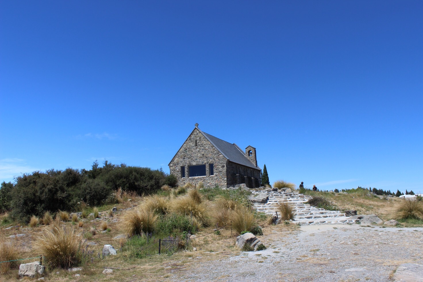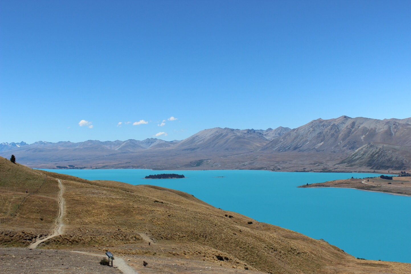 Zu der Planänderung kam es im Endeffekt, weil wir gestern einen Wanderführer mit kurzen Wanderungen in Neuseeland entdeckt und natürlich gekauft hatten. In diesem Führer war am Lake Tekapo ein 45minütiger Rundweg am Mount John beschrieben, den wir gerne machen wollten. Allerdings müssen wir wohl irgendwo falsch abgebogen sein, denn am Ende fanden wir uns auf dem 1030m hohen Gipfel des Mount John wieder.