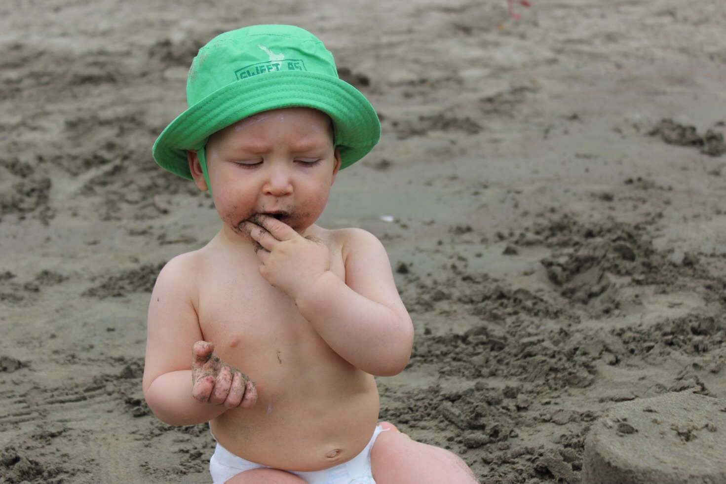 Außerdem macht krabbeln im Sand offensichtlich so großen Spaß, dass sogar der neu gekaufte Sonnenhut klaglos auf dem Kopf blieb.